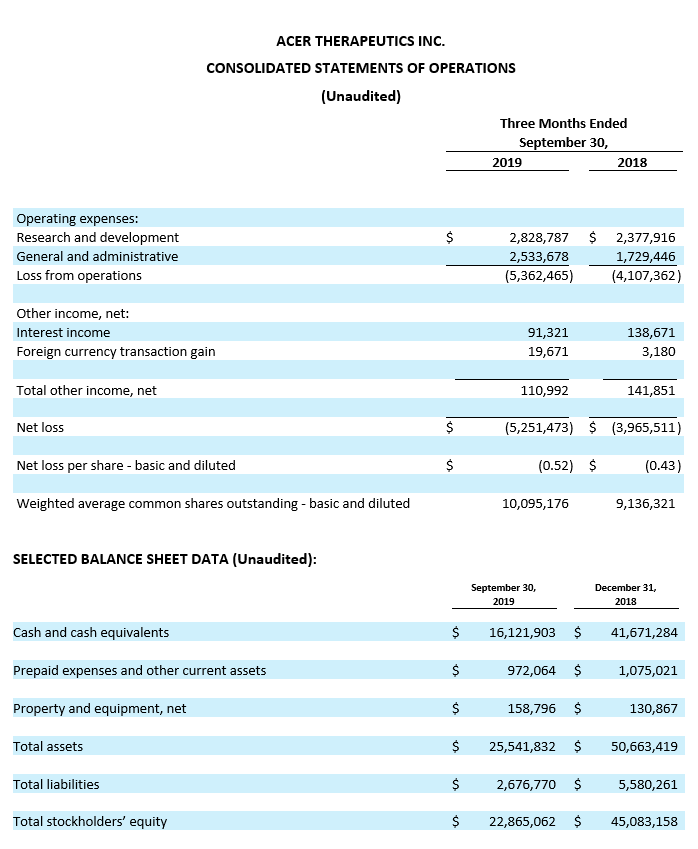 NEWTON, MA – Nov. 13, 2019 – Acer Therapeutics Inc. (Nasdaq: ACER), a pharmaceutical company focused on the acquisition, development, and commercialization of therapies for serious rare and life-threatening diseases with significant unmet medical needs, today reported financial results for the third quarter ended September 30, 2019 and provided an update on the Company’s recent corporate developments.