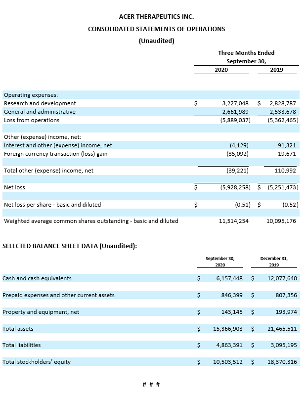 NEWTON, MA – Nov. 10, 2020 – Acer Therapeutics Inc. (Nasdaq: ACER), a pharmaceutical company focused on the acquisition, development and commercialization of therapies for serious rare and life-threatening diseases with significant unmet medical needs, today reported financial results for the third quarter ended September 30, 2020, and provided an update on the Company’s recent corporate developments.
