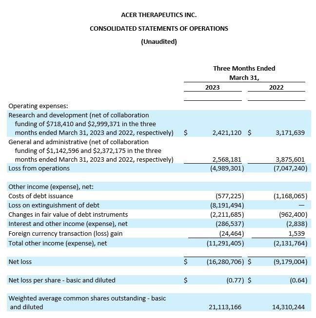 NEWTON, MA – May 15, 2023 – Acer Therapeutics Inc. (Nasdaq: ACER), a pharmaceutical company focused on the acquisition, development and commercialization of therapies for serious, rare and life-threatening diseases with significant unmet medical needs, today reported financial results for the first quarter ended March 31, 2023 and provided a corporate update.